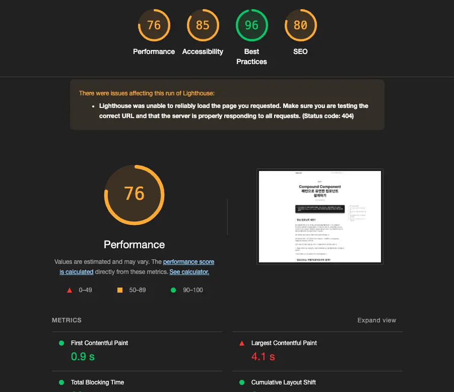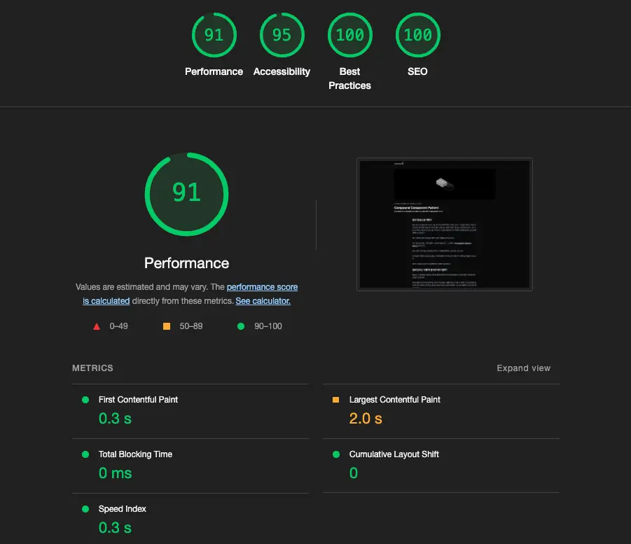 Lighthouse 로 간단하게 측정해 보아도 확연한 차이가 보입니다. Static Rendering 덕분에 페이지를 미리 완성해 둘 수 있어 피드에서 아티클을 클릭하는 즉시 navigate 되는 점이 굉장히 인상적입니다.