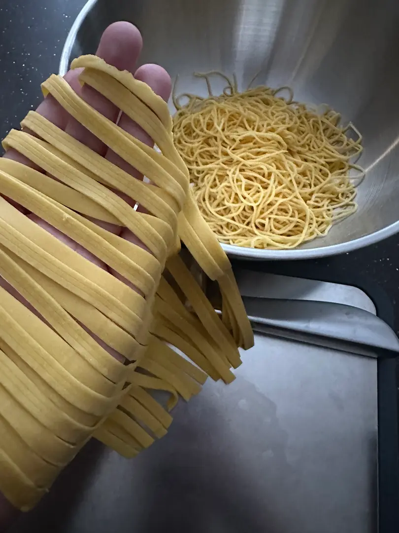 반죽은 힘들지만 면 뽑는 건 되게 재밌습니다. 틀에 따라 면 모양도 기호에 맞게 선택할 수 있는데, 넓적한 링귀니가 식감도 좋고 포만감도 좋았습니다.